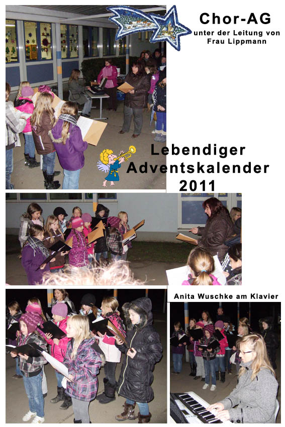 Leider liegt noch kein aktueller Bericht von der Chor-AG vor. Doch sie können sich hier schon mal eine Fotomontage des letzten Auftritts beim Lebendigen Adventskalender am 13.12.2011 ansehen.