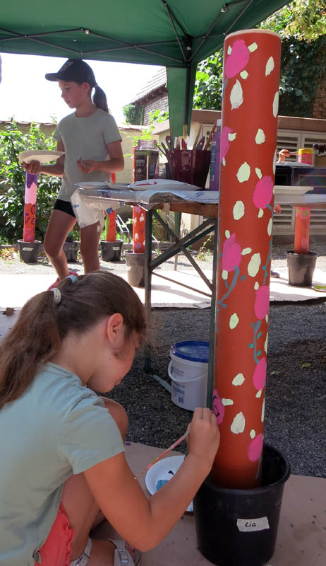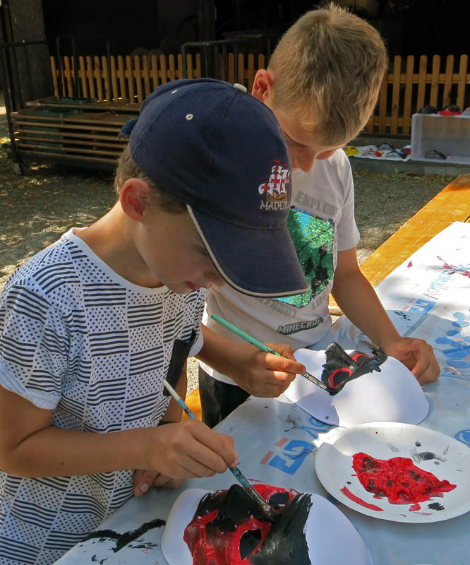 ca. 50 Kinder der Nibelungenschule um ihrer Kreativität freien Lauf zu lassen. Bei schönstem Wetter wurde gehämmert (Segelschiffchen bauen), gemalt (Masken, Stelen)