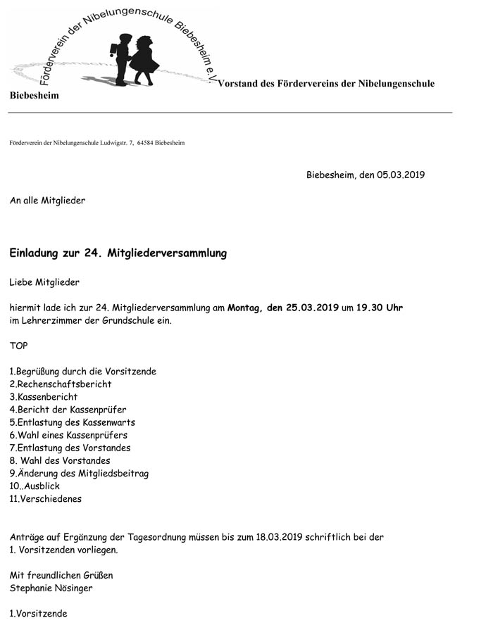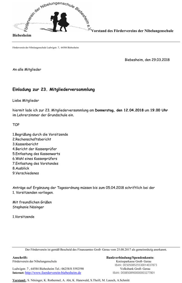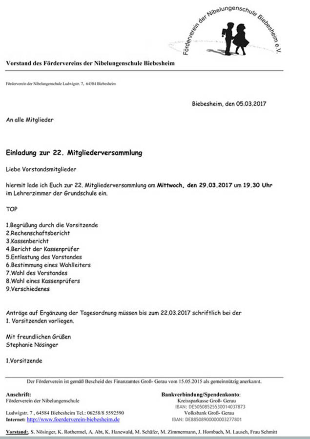 - 8. Änderung des Vereinssatzung (Namensänderung des Vereins zu "Förderverein der Nibelungenschule")