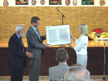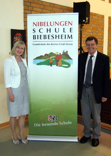 Mit der Überreichung der Namensurkunde an Rektorin Adriane Schmitt durch Landrat Will wurde gleichzeitig das neue Logo der Grundschule in Biebesheim, ab jetzt Nibelungenschule genannt, enthüllt. ![]() Dieses Hagenbild ist aber nun unter der Isolierschicht der sanierten Schule verschwunden. Es wird aber ersetzt werden durch eine hinterleuchtete Metallarbeit, welche sich an das Hagenmotiv anlehnt, aber gleichzeitig einen Bezug zur Schule hat. ![]() Von den Biebesheimer Künstlern Abramzik gestaltet, verschwindet der Schatz nicht einfach in den Tiefen des Rheines, sondern wird zu Buchstaben und Zahlen, dem Arbeitsmaterial der Schule. ![]() Untermalt wurde die Feier durch Spiel- und Gesangseinlagen der Schulkinder, welche vom Auditorium begeistert aufgenommen wurden. ![]() Ein Sektempfang in der Kleinen Aula der Schule rundete die gelungene Feier ab. |